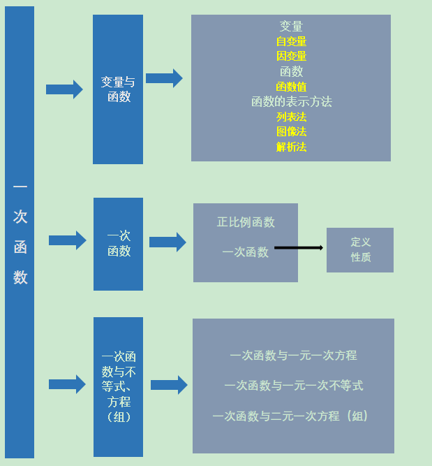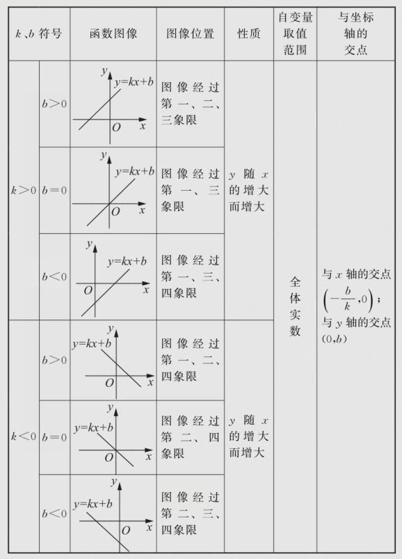 (1)一次函數:一般地,形如y=kx+b(k、b為常數,且k≠0)的函數,叫作一次函數,其中x是自變量,y是x的函數。特別地,當b=0時,y=kx(k為常數,且k≠0),y叫作x的正比例函數,由此可以看出,正比例函數是一種特殊的一次函數。