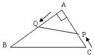 Rt△ABC中,∠A=90°,AB=8cm,AC=6cm,P、 Q分別為AC,AB上的兩動點,P從點C開始以1cm/s的速度向點A運動,Q從點A開始以2cm/s的速度向點B運動,當一點到達終點時,P、Q兩點就同時停止運動。設運動時間為ts。